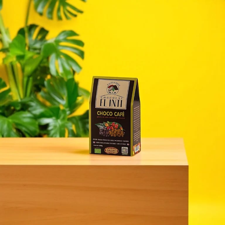 Ingrédients : 64 % de chocolat d’enrobage (fèves de cacao, panela, beurre de cacao), 35% de grain de café, 1 % de cacao en poudre
